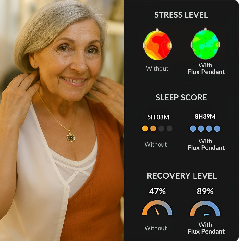 More than jewelry β the Flux Pendant is designed to reduce stress, improve sleep, boost energy and support your overall well-being. A daily ally for balance in a world full of EMFs.